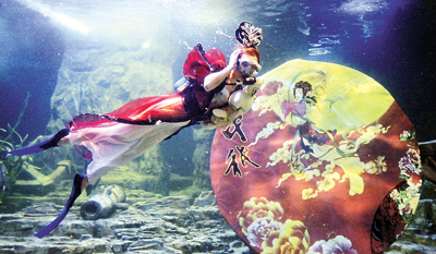 2010年中秋佳节,武汉东湖海洋世界的女潜水员穿上古装扮作“嫦娥”,为节日里前来参观的游客献上一幕海底“嫦娥奔月”的演出。 新华社发 王振武 摄