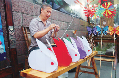 2007年中秋节,在成都的锦里民俗休闲街,一个手工艺人正在制作“玉兔”灯笼。 新华社记者 杨 纯 摄 |