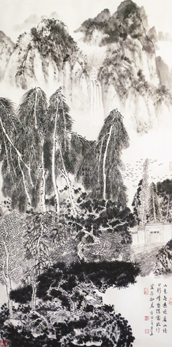 李建华的山水画作颇有气吞山河的霸气与活力。这一幅幅奔来眼底的崇山峻岭、峰峦叠嶂、山川水树,既给观赏者以眼光之悦,也会给人一种超凡拔俗的震撼。留连其中时,会感觉这些丹青山水,似黄山不似黄山,似峨眉不似峨眉,恰如白石老人所言,一切均“贵在似与不似之间”。能深切地感受到他的近作既有山川的点拨之悟,峰峦的滋润之美,也有画家神游其中突兀而起的非凡创造。站在他的画作前,一切都是新鲜的,新的天地,新的山水,新的气息,新的季节,新的色彩,并在这样的腾挪转换之中,给人一种新的感受,让看客在瞬间里有脱胎换骨的感受。正如李建华所言,大自然是他最好、最慷慨的老师,他就是不断地向大自然求教,用心灵将自然的启示融汇于笔端,再勾勒于素绢之上,继之花鸟鱼虫,楼台亭阁,古风人物,让他创作的世界,于静中可以闻风动,于绿中可以闻爽气,于无声中可以闻有声,俯仰之间,使他的画作充满了韵律之美、灵秀之气和洒脱。或是正因如此,李建华的画才能成为画坛众多方家赞赏备至乃至抢手的佳品。