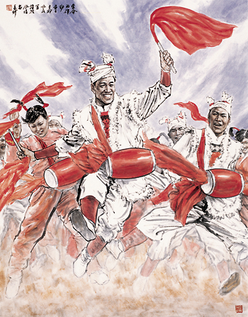绘画不分中西,人物最难。就中国人物画而言,单论技巧,难就难在造型与笔墨的有机结合上,这实为中国人物画的核心与灵魂,又实为多少画家终生求索而不得要领的难题。苗再新毕业于解放军艺术学院,接受的是正规学院派的素描教学,有着坚实的造型能力。难能可贵的是,科班出身的他并没有拘泥于“徐蒋体系”或“黄胄体系”,而是“自己画自己的”。正因为没有过多的负担与挂碍,苗再新在造型与笔墨结合的探索上轻松了许多。他认为,在把握中西交融中固守住中国绘画的本质是最重要的,也就是说,你的作品让人第一眼看到时首先感觉应是中国画,然后再讲其他。这实际上是契合了潘天寿提出的“距离说”。在警惕并坚守这条底线的前提下,苗再新亦科学地践行着“融合说”的观点,注重将现代审美意识融于传统技法,将西画的科学性与国画的精神性交汇一体,创造出素描、结构与笔墨天然合一的一家笔法,形成了坚实饱满、大气磅礴的艺术风格,在中国人物画发展的历史进程中建立起了自己的明确坐标。苗再新的这种探索与成就,充分运用于《民族之光》大型组画的创作。如在表现汉族风情安塞腰鼓的《生命的律动》中,鼓手面部的刻画就极为典型:白纸对青天,斩钉截铁地一笔下去,既是素描,又是结构,更是地地道道的中国水墨,由于三者水乳交融,让人感觉不到有素描的影子,而这种素描所体现出的结实、丰富的效果,却将蕴藏在人物体内的生命张力最大限度地开掘了出来,使欢腾的鼓手仿佛从画面跃然而出。