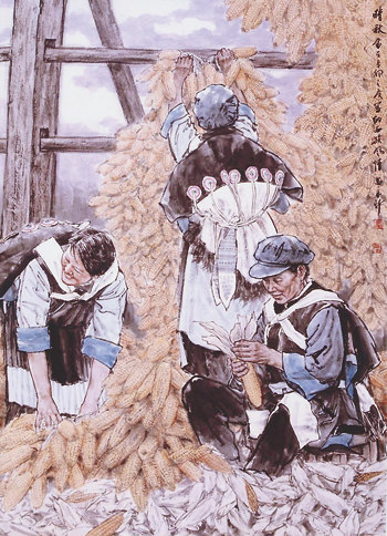 以和谐的画面表达和谐的内涵,这是苗再新在创作中牢牢把握的重要原则,也是他探索与追求的目标。从这个意义上讲,56幅民族风情画创作的过程,实现上也是一个斟酌取与舍、调合墨与色、处理繁与简的过程。许多同一地域的兄弟民族生活习俗、衣着服饰非常接近,如回族与保安族、东乡族、撒拉族在画面呈现上就难以区分,为避免雷同,苗再新便以不同场景的选取加以区别,回族对唱花儿的纵情、保安族击水中游的勇毅、东乡族巧手绣花的细腻、撒拉族辣椒丰收的喜悦,把4个民族的风情鲜活生动地表现了出来。衣着艳丽也是兄弟民族的一大特点,如何既真实反映生活,又保持水墨韵味,还要整体构成协调,苗再新在每一幅画作中都匠心独运、巧作安排。《壮家织女》《珞巴汉子》《高原雄鹰》以墨为主、意韵相生,《幻彩山乡》《阿细跳月》《草原春色》以彩为主、绚烂如梦,《生生不息》《岁月有痕》《畲家姑娘巧梳妆》墨色并用、相辅相成,而《火红的日子》《挑花毯》《羌寨秋艳》则着意突出一种或两种颜色,给人以强烈的视觉冲击。在如何处理兄弟民族的繁琐佩饰方面,苗再新借鉴了油画找大感觉的方法,在笔墨运用上高度提炼,观来既符合实际,又毫无繁复之感,保持了国画的写意特质,这在《盛装》《和声》中得到了完美体现。