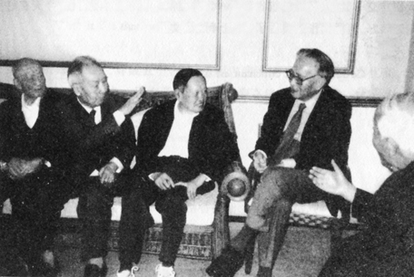 西南联大文法理工学院老友欢迎杨振宁,摄于北京大学。左起:朱光亚(学理),许渊冲(学文),杨振宁,王传纶(学法,中国人民大学教授),王希季(学工,地球卫星回收总设计师) |