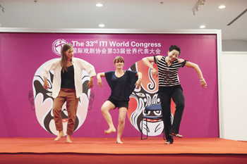 由国际剧协、中国剧协、厦门市政府、福建省文化厅联合主办的国际剧协第33届世界代表大会日前在厦门开幕。在9月22日举行的中国地方戏曲工作坊上,著名福建梨园戏表演艺术家曾静萍与外国戏剧同仁互动,教他们梨园戏中的丑角表演。