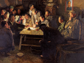 取改革开放初期对中国农村生产关系变革发生重大影响的事件作为作品题材的《1978年11月24日夜·小岗》,是一件语言质朴无华的佳作。安徽凤阳县的18户农民自发地试验生产责任制,揭开了我国农村改革的序幕。这一事件之所以激发起少伦的创作灵感,是因为他是结合他家乡的变化来理解这一事件的。他既是画这一特定的事件,同时也是画自己的感受。画中人物形象取自他熟悉的农民,人物在明暗强烈对比的光线中聚会在一起,面对要做出在当时来说相当冒险的抉择,此时此刻不同经历和不同性格的人物,有微妙的心理反应。因为描绘的是室内灯光下的情景,画面色彩较为暗淡。乍一看,这幅画没有强烈的视觉效果,但细细观赏却是色调浑厚、丰富,有相当艺术格调的好画。