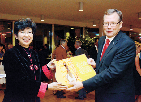 在招待酒会上,赵实向皮亚·哈特金和肯特·安德森分别赠送了一幅真丝刺绣长卷《颐和园》以及一把工艺琵琶。