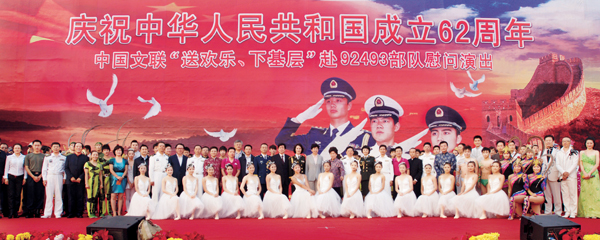 在举国上下隆重庆祝建党90周年、喜迎新中国成立62周年之际,为深入学习贯彻胡锦涛总书记“七一”重要讲话精神,认真贯彻中央关于开展“走基层、转作风、改文风”活动的部署,由中国文联主办,中国杂技家协会、中国文联国内联络部承办,中国文联所属各全国文艺家协会协办的“送欢乐、下基层”赴海军某部慰问演出于9月24日至25日举行。中国文联党组书记、副主席赵实,中国文联党组副书记、副主席李屹率领由杂技、戏剧、电影、音乐、舞蹈、曲艺、美术、书法、摄影、电视、民间文艺等200多名艺术家组成的慰问演出团,带着党和政府的亲切关怀和全国文艺工作者的深情厚谊,来到海军某部,为这里的官兵奉献上丰富多彩的高水准文艺演出。