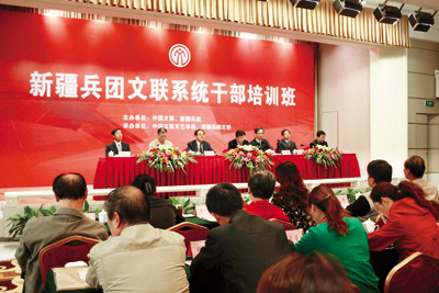 中国文联和新疆生产建设兵团共同主办,中国文联文艺学校和新疆生产建设兵团文联共同承办的“文艺援疆——新疆生产建设兵团文联系统干部培训班”,是认真贯彻落实胡锦涛总书记“七一”重要讲话精神和中央第二次“全国对口支援新疆工作会议”精神的具体体现。中国文联党组高度重视此次培训,并将兵团文联工作纳入全国文联工作的全局来考虑。兵团的文联工作和文艺工作是我国文艺事业大发展中不可或缺、不可替代的一支重要力量。新疆生产建设兵团在“实现新疆跨越式发展和长治久安”的战略任务中,责任重大,使命光荣;兵团文联在促进兵团文化健康发展,鼓舞斗志,凝集力量等方面,大有可为,任重道远。