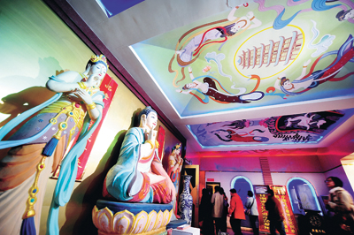 10月26日,观众从敦煌大剧院内以莫高窟石窟艺术为主题的装饰旁走过,入场观看大型杂技剧《敦煌神女》。当日,大型杂技剧《敦煌神女》在敦煌大剧院上演。《敦煌神女》是甘肃省杂技团与敦煌杂技艺术歌舞剧院以敦煌莫高窟壁画故事为题材,打造的集歌舞、音乐、魔术、杂技、武术于一体的大型杂技剧,讲述了美丽勇敢的鹿女历尽磨难、不惜生命造福人类的故事。