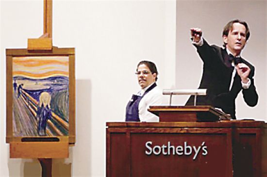 北京时间5月3日上午,享誉世界的挪威艺术家爱德华·蒙克的旷世经典之作《呐喊》在美国纽约苏富比进行的印象派及现代艺术专场拍卖会上作为第二十件拍品登场,最终以1.07亿美元落槌,加上佣金共计1.199亿美元成交,创造了世界艺术品拍卖价格的最高纪录。之前的拍卖价格纪录是以1.06亿美元成交的毕加索的《裸体、绿叶和半身像》。