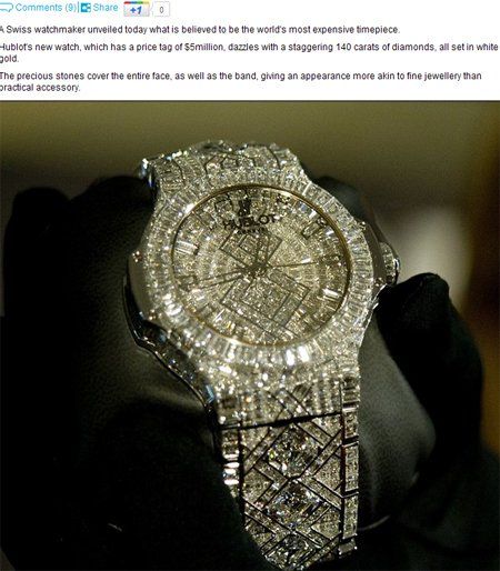 据英国《每日邮报》3月8日报道,瑞士一家钟表商日前造出世界上最昂贵的手表,它上面镶嵌1292颗钻石,售价500万美元(约合3153万元人民币)。