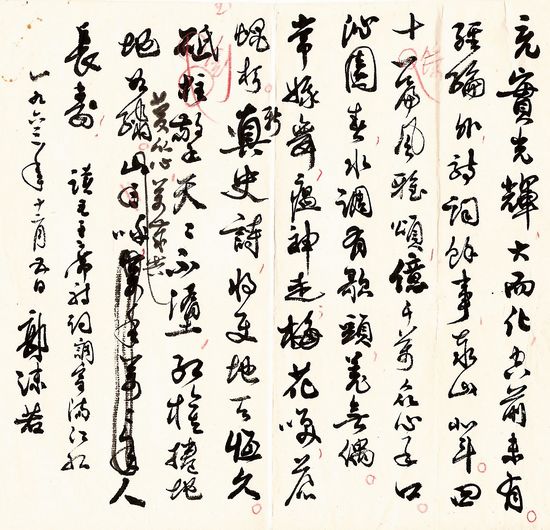 书札的文化内涵与多重价值主要体现在以下几方面:一是名气大小,二是内容如何,三是书法艺术,四是所用材料,五是品相性状。我们以1963年郭沫若读毛主席诗词《调寄满江红》为例:郭沫若是现代著名书家,书法初学颜真卿,又参柳公权、米芾、董其昌、赵孟頫诸家笔意,旁涉甲骨、金文,晚期形成自己风貌,人称“郭体”。其所作行草书,铁画银钩、长枪大戟、肆意纵横、自由洒脱,加之深厚修养和渊博知识滋养,使他自然成为现代文人书法的代表人物。在文物艺术品市场上,其作品受到热烈追逐,价位一直名列前茅。2011年中国嘉德秋拍,他的七言对联录毛主席诗句“喜看稻菽千重浪,跃上葱茏四百旋”以690万元成交。而《调寄满江红》为创作文词,内涵丰富,既能让人欣赏他的书法艺术,又能展现他的诗人风采。虽然篇幅不长,却满纸云烟。还有铅笔修改字迹,发表前修改样稿,与诗刊定稿对照,可以清晰看到如此大家对其作品反复推敲修改的痕迹和进退拿捏的心路历程。词中所说读毛主席诗词,指的是人民文学出版社1963年12月版所发表的毛主席诗词一组37首,其中最后一首就是毛主席1963年1月9日所作《满江红——和郭沫若同志》,而这也是和此前郭沫若的另一首满江红“沧海横流,方显出英雄本色……”3篇《满江红》,用中国古典诗词的形式,通过唱和,直击当时国内外重大事件,引经据典,比喻夸张,幽默讥讽,表达了中国领袖的鲜明立场、豪迈信心和革命浪漫主义情怀,充分体现出郭沫若对毛主席的崇拜以及和毛主席的切磋与交往。这组词稿为历史名人所作,又记录了重大历史事件,书法俊美,诗情激荡,内涵深邃,外延广阔,既高瞻远瞩,又趣味盎然,给人诸多美感和无限遐思。