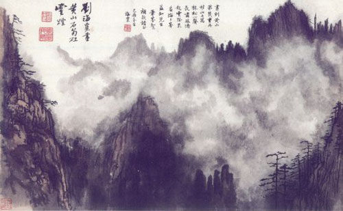 黄山是刘海粟一生反复描绘的题材,《黄山烟云》(图一,纸本,尺寸:56x90cm),创作于1969年,在众多黄山题材的作品中,它也许不那么抢眼,但它是刘海粟过渡时期的重要作品,它既能让我们窥见画家前期的山水画样式,又能让我们知道后来泼彩山水的根源所在。这件作品特别值得一提的是水墨的渲染:山石的体积感靠渲染,云雾轻柔的质感靠渲染,光影的明暗靠渲染,它已经不再是勾勒之后可有可无的一种辅助方式,而是作者主要的表现手法,正是通过层层加染,使画面厚实丰富,意蕴无穷。