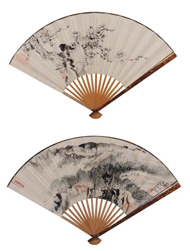 陆俨少 山村新貌 白梅成扇 设色纸本 成扇 18×49cm