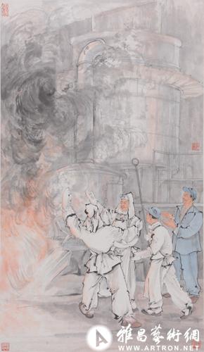 陆俨少 炼钢工人 设色纸本 立轴 91×52cm