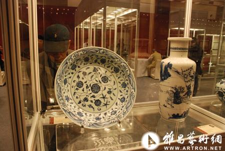 另外一件是明洪武时期的釉里红缠枝牡丹菊纹大碗,洪武时期上承元代官窑青花瓷器的精髓,为后世永乐,宣德朝的中国制瓷业的高峰奠定了坚实的基础。如果说洪武时期青花品种较之元代尚未有大的突破的话,那么釉里红品种到了此时可谓一枝奇葩。它一改元末釉里红呈色灰暗不纯的现象,成功地呈现出色泽鲜亮,发色稳定的全新风貌。因为传世的洪武瓷器极少,所以该件釉里红缠枝牡丹菊纹大碗就显得格外珍贵。