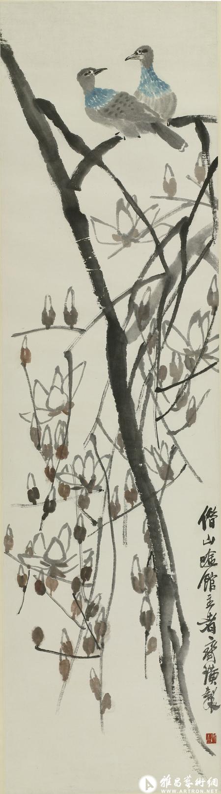 齐白石 玉兰斑鸠 设色纸本 立轴 178×47cm