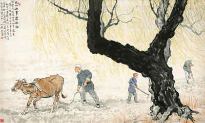 《九州无事乐耕耘》是徐悲鸿于1951年创作并赠送给郭沫若的。此画不仅是新中国成立后徐悲鸿最大的一幅作品,而且把土地改革、抗美援朝等时政题材寓于其中,有着鲜明的时代印记。