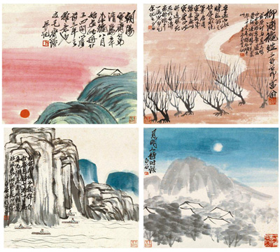 齐白石《山水册》(局部),作于1931年秋天,共12开。据其中《朝阳》一页的题跋:“此册廿又四开”,可推断目前所见是其中一半,另一半不知去处。册页的题材,大体源于白石老人的远游印象和家乡记忆,画法则来自在前人图式和写生基础上的创造。