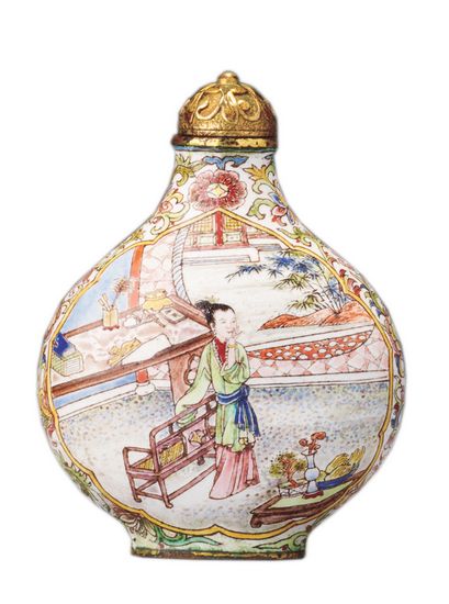 铜胎画粉彩庭院仕女图鼻烟壶