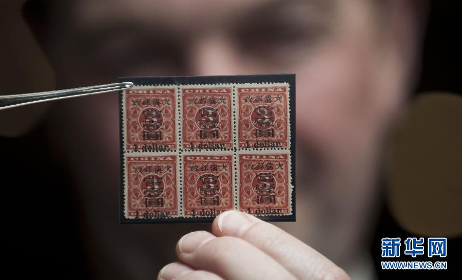 1月8日,邮票专家尼尔·格兰杰在展示1897年红印花加盖3分大字当壹圆六方连票,估价250万至300万港元。当日,斯宾克拍卖行宣布将于1月13日在香港举行珍罕邮品拍卖会。 (新华社记者 吕小炜 摄)
