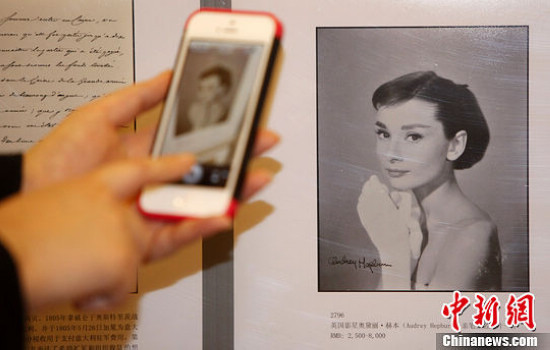 5月14日,观者在中国嘉德2013春季拍卖油品钱币预展现场翻拍即将拍卖的拍品――英国影星奥黛丽 赫本亲笔签名照。如今,越来越多的收藏类别走进中国拍卖场,受到收藏者的青睐和追捧。