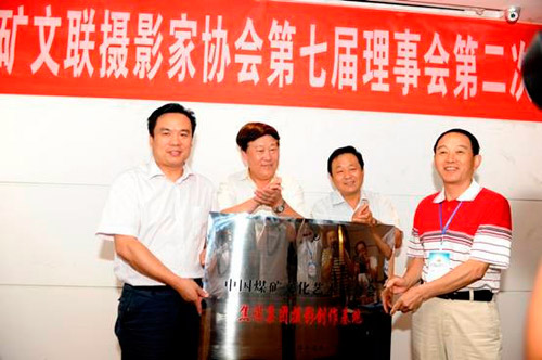 中国煤矿文联副主席、秘书长张强(右二),中国职业健康协会副理事长、中国煤炭记者协会会长、中国煤矿摄影家协会主席白海金(左二)共同为焦煤集团摄影创作基地授牌,焦煤集团原副总经理、焦煤集团摄影家协会主席贾建峰(右一),焦煤集团公司工会副主席李润波共同接受授牌。