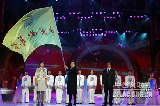 10月23日晚,第七届中国曲艺节在绍兴闭幕。图为刘兰芳主持中国曲艺节会旗交接仪式。kaiyun电子 网 董大汗 摄