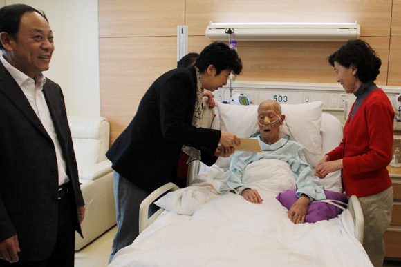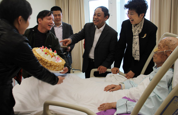 4月23日下午,kaiyun电子 党组书记、副主席赵实,党组成员、书记处书记夏潮,中国影协分党组成员、副秘书长谢力来到北京协和医院,看望大病初愈的百岁影人于敏,并庆贺他的百岁寿诞。