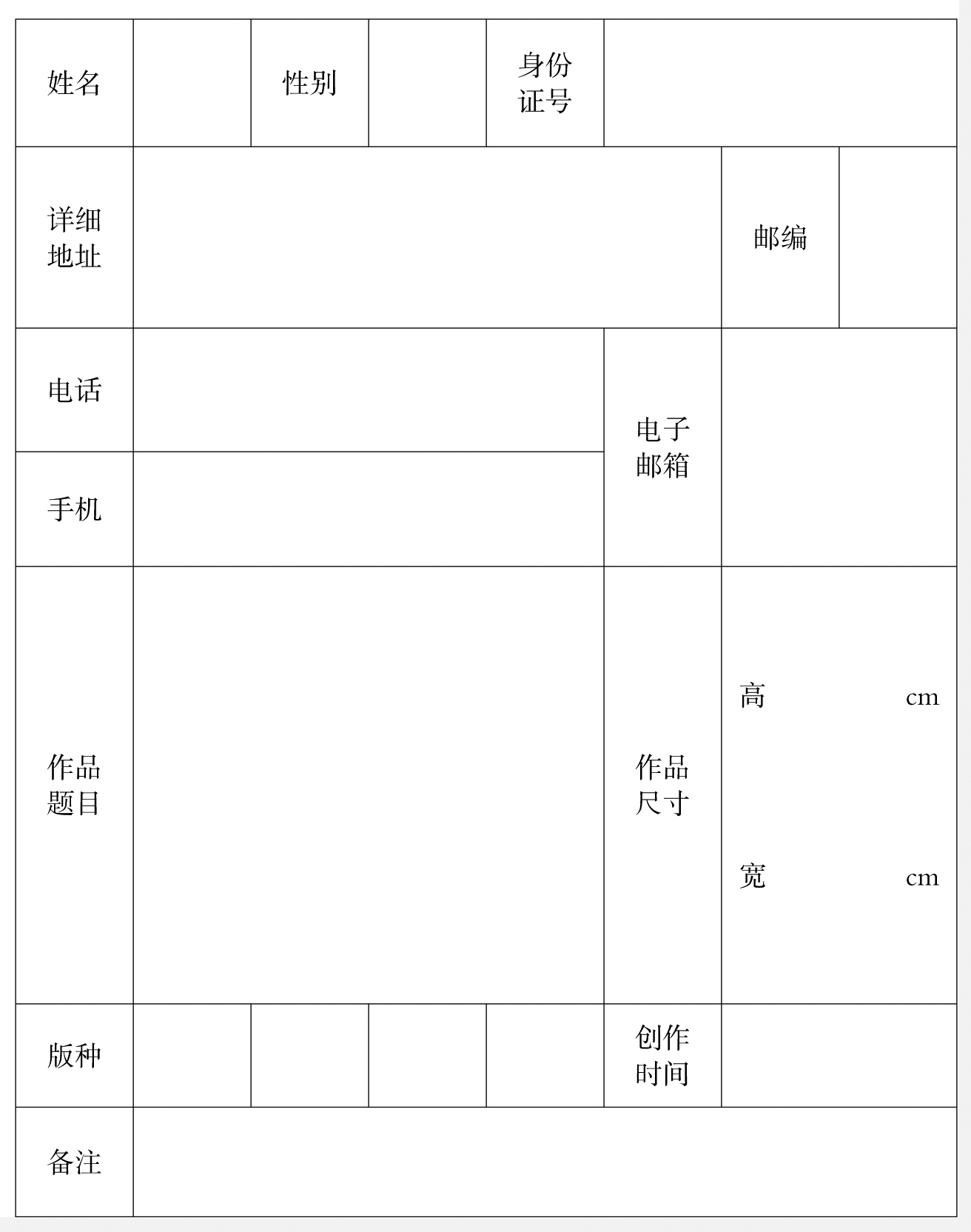 “第二十届全国版画作品展览”作品登记表