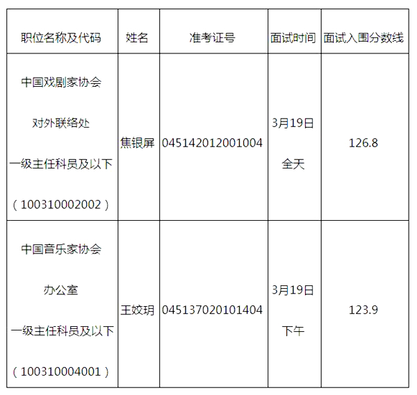 因个别考生放弃面试资格,根据公务员考录相关规定,从报考同职位符合条件考生中,按照笔试成绩由高到低的顺序,确定面试递补人员2名。递补人选名单如下:
