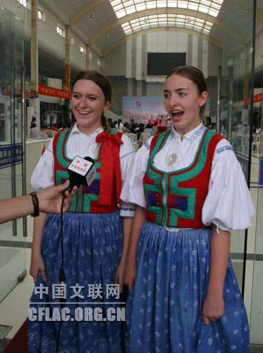 10月7日晚,由中国文联和江苏省人民政府共同主办,江苏省文化厅、江苏省文联、苏州市人民政府联合承办的第八届中国国际民间艺术节,在苏州工业园区科技文化艺术中心隆重开幕。艺术节期间,来自世界五大洲14个国家的1200多名中外艺术家,在江苏苏州5市7区,采用舞台演出和即兴展示相结合的方式进行巡回展演。图为10月8日,捷克维萨坎民间舞团的演员在演出结束后接受采访。中国文联网 余宁 摄