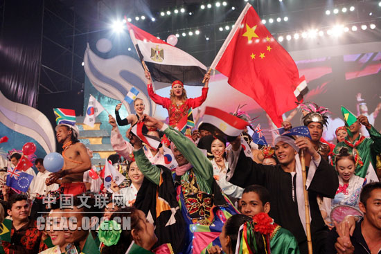 10月7日晚,由中国文联和江苏省人民政府共同主办,江苏省文化厅、江苏省文联、苏州市人民政府联合承办的第八届中国国际民间艺术节,在苏州工业园区科技文化艺术中心隆重开幕。艺术节期间,来自世界五大洲14个国家的1200多名中外艺术家,在江苏苏州5市7区,采用舞台演出和即兴展示相结合的方式进行巡回展演。图为各国艺术家同台表演,激情四射。国际民间艺术节是一个各国艺术家相互交流的盛大节日。中国文联网 孟祥宁 摄